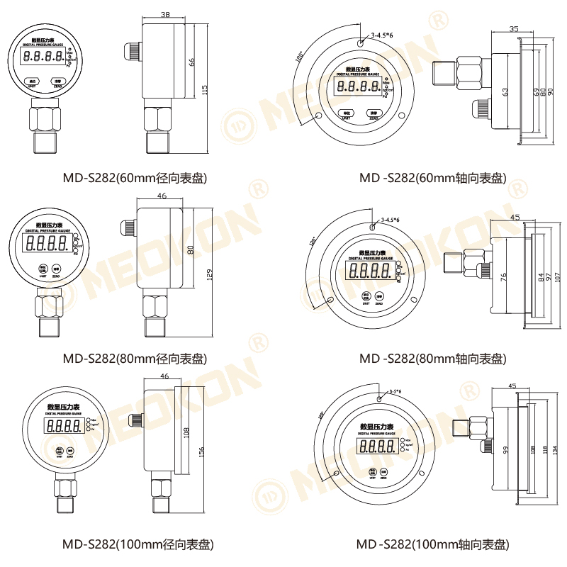 該系列數(shù)顯壓力表包括表盤(pán)直徑為60mm/80mm/100mm三款徑向不銹鋼壓力表, 60mm/80mm/100mm三款軸向不銹鋼數(shù)顯壓力表。
